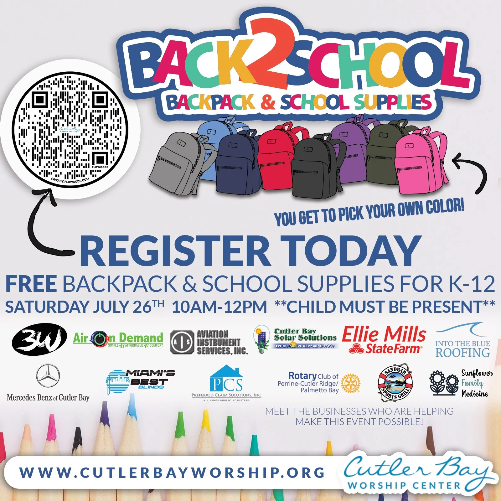 We want to ensure that everyone who comes gets what they need, so, by having you register, we are ensuring that when you come, there will be a backpack and supplies for the grade your child is entering!